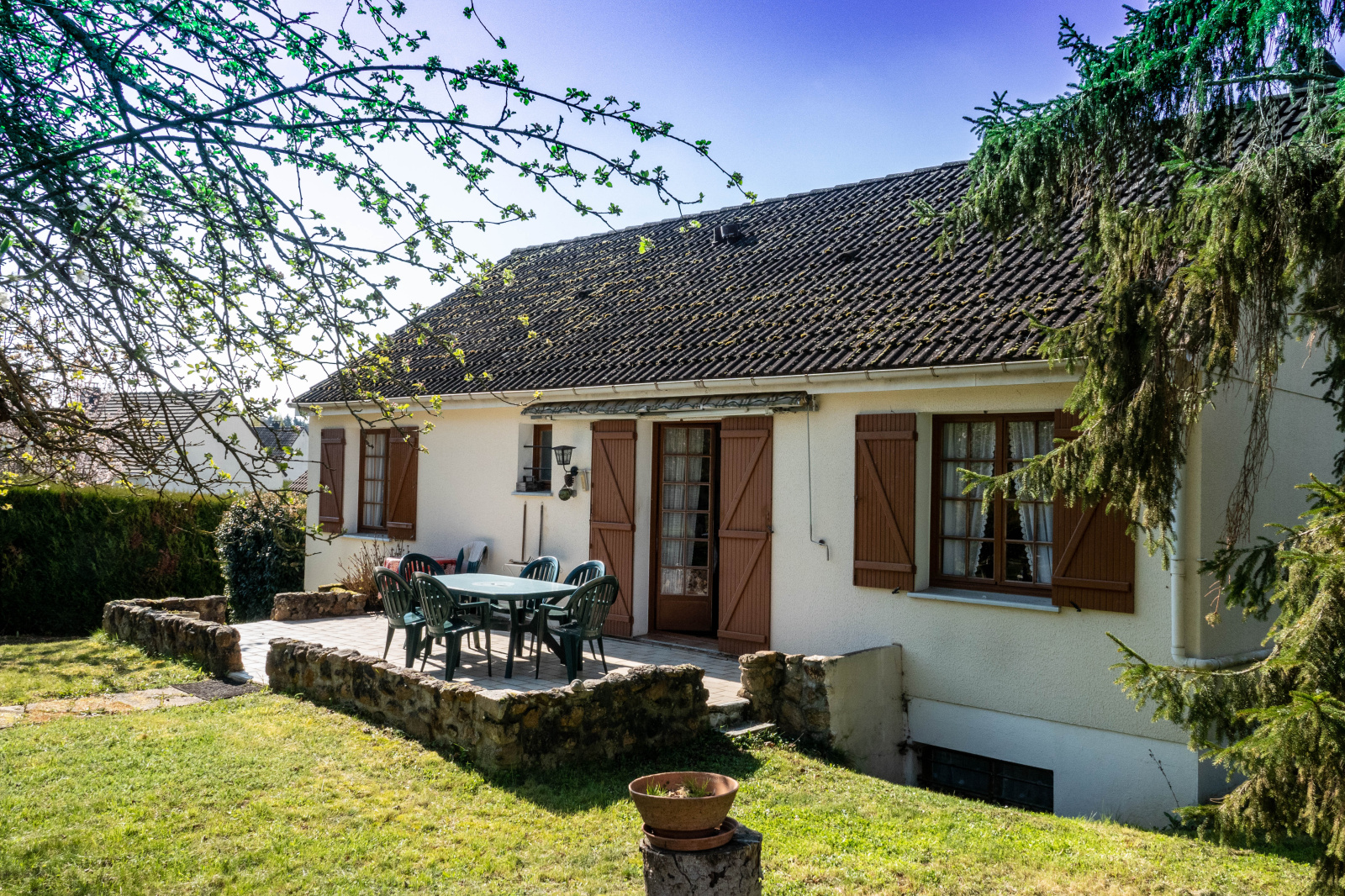 Implanté au milieu de son jardin paysager, ce pavillon d'une surface de 103m² sur 1500m² terrain clos vous offre une vue sur la campagne et un espace propice à des moments agréables en famille et entre amis.